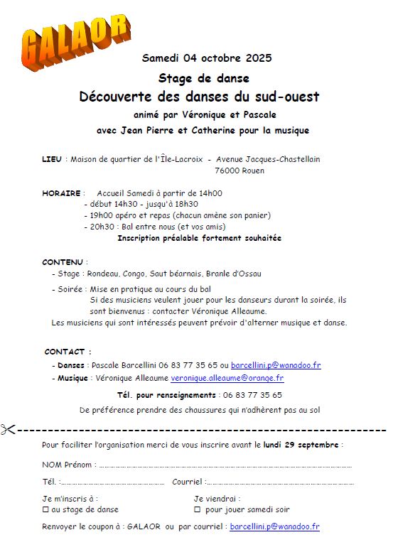 à Rouen (76) Stage de danses du Sud Ouest avec Pascale et Véronique, organisé par Galaor, salle de la maison de quartier de l’Île Lacroix, à partir de 14h .