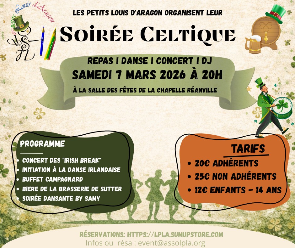 à la Chapelle Réanville (27) Soirée celtique avec Irish Break, 20h à la salle des fêtes. Dates de l'événement: Samedi, 7 Mars, 2026Image: