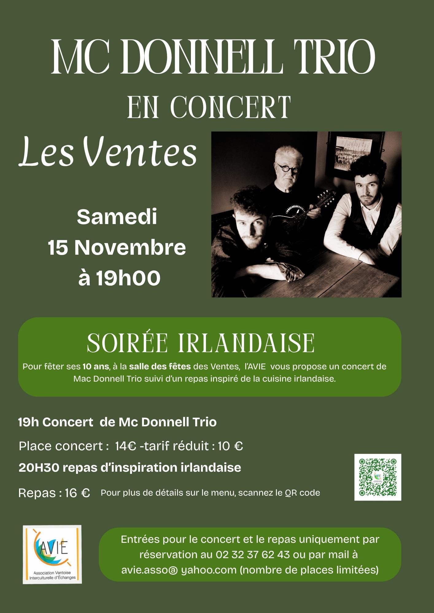 15 novembre à les Ventes (27) Concert de McDonnell trio , musique irlandaise à 19h, organisé par l’association AVIE