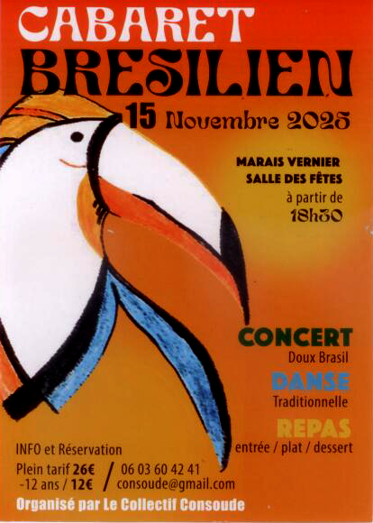 au Marais Vernier (27) , Cabaret Brésilien à partir de 18h30, Concert Doux Brasil, danse traditionnelle, repas (entrée, plat, dessert).