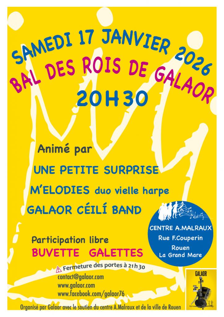 à Rouen (76) Bal des rois de Galaor, à 20h30 au Centre André Malraux, avec Une petite surprise, Le duo M’Elodies et Galaor Céili Band