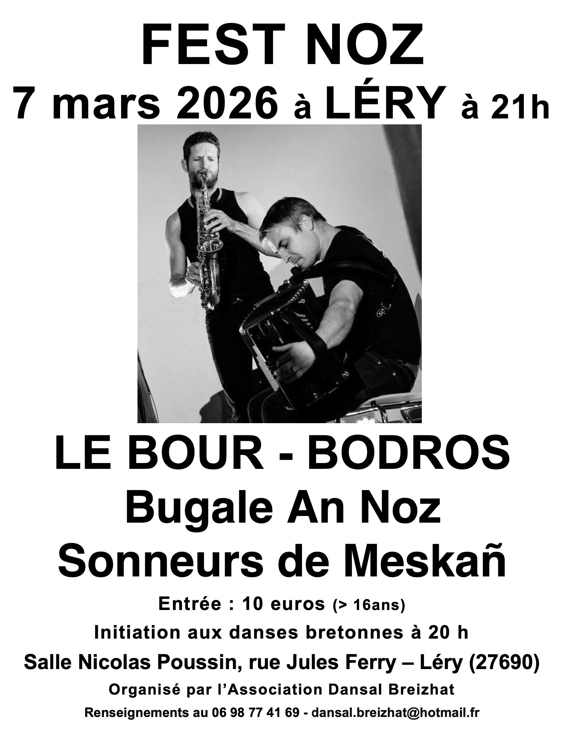 "L’association Dansal Breizhat vous invite à une grande soirée Fest-Noz le samedi 7 mars 2026 à Léry (27).