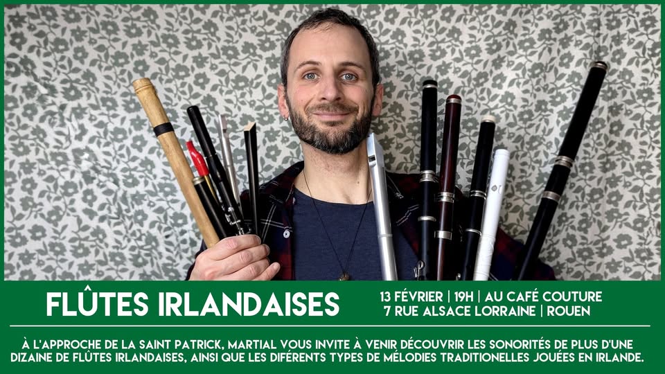 à Rouen (76) Martial Benoit présente les flûtes irlandaises au Café couture. Dates de l'événement: Vendredi, 13 Février, 2026Image: