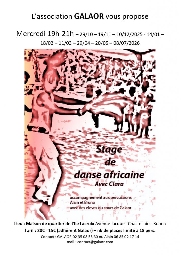 à Rouen (76) Stage de danse africaine de 19h à 21h à Maison de quartier de l’Ile Lacroix : Avenue Jacques-Chastellain 76000 Rouenorganisé par Galaor